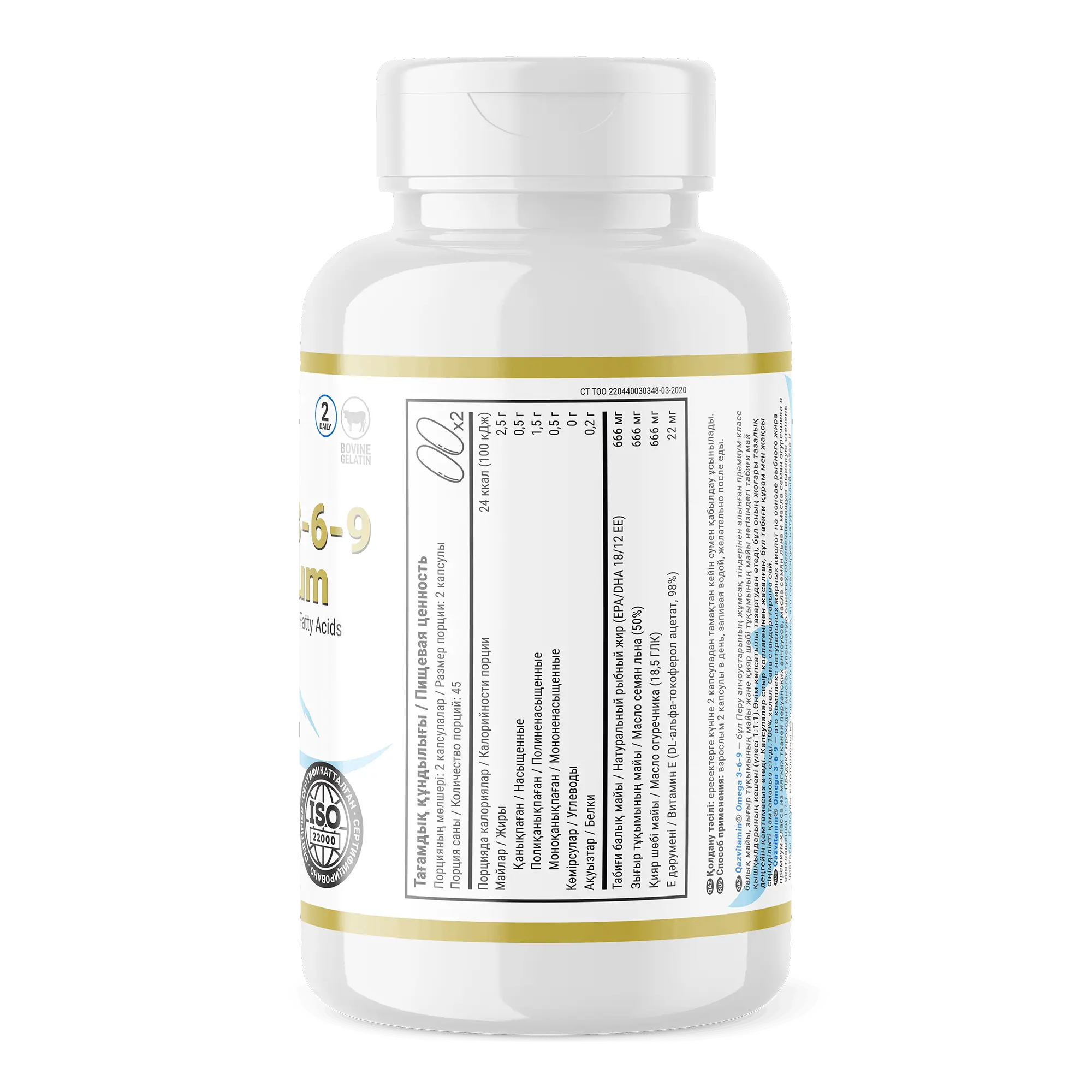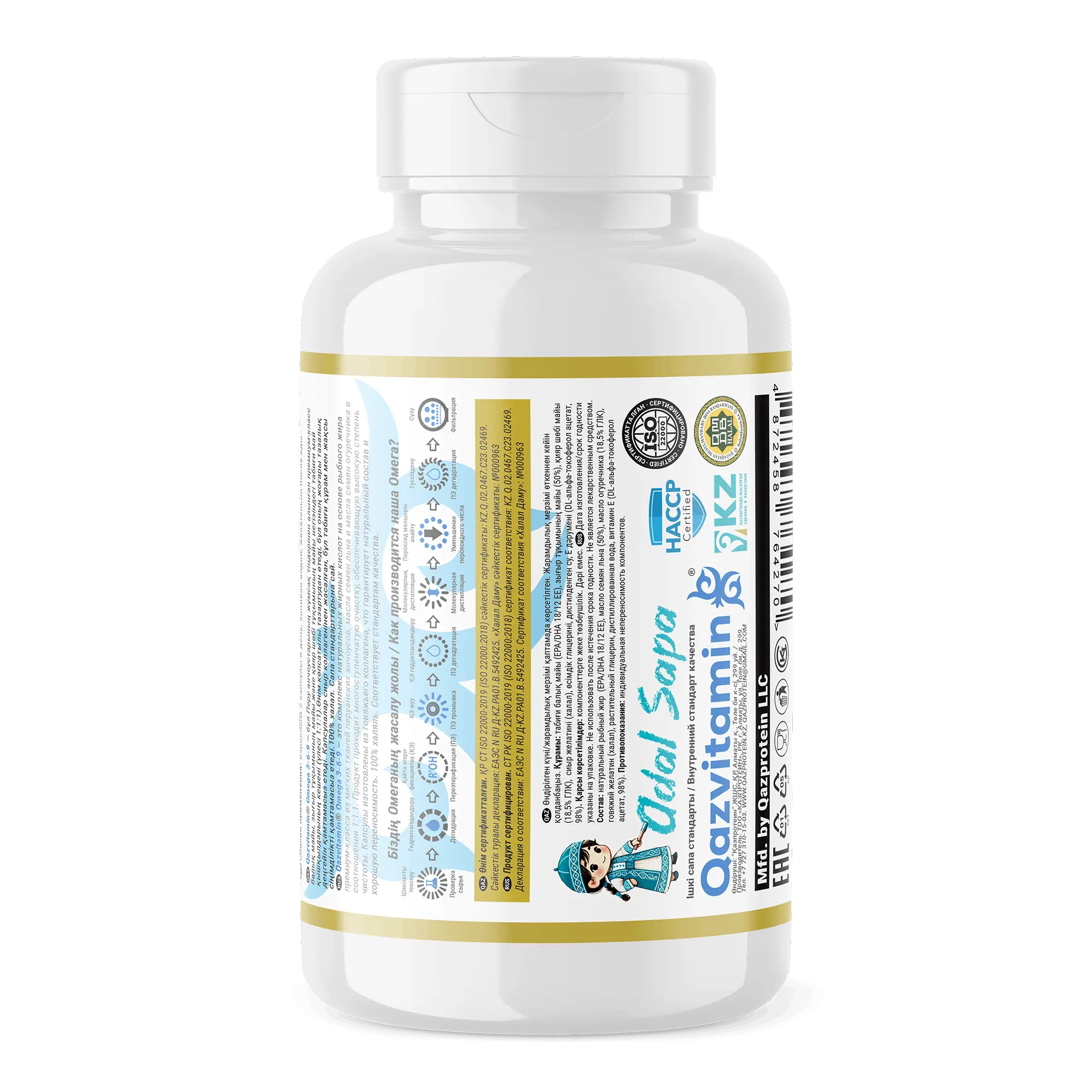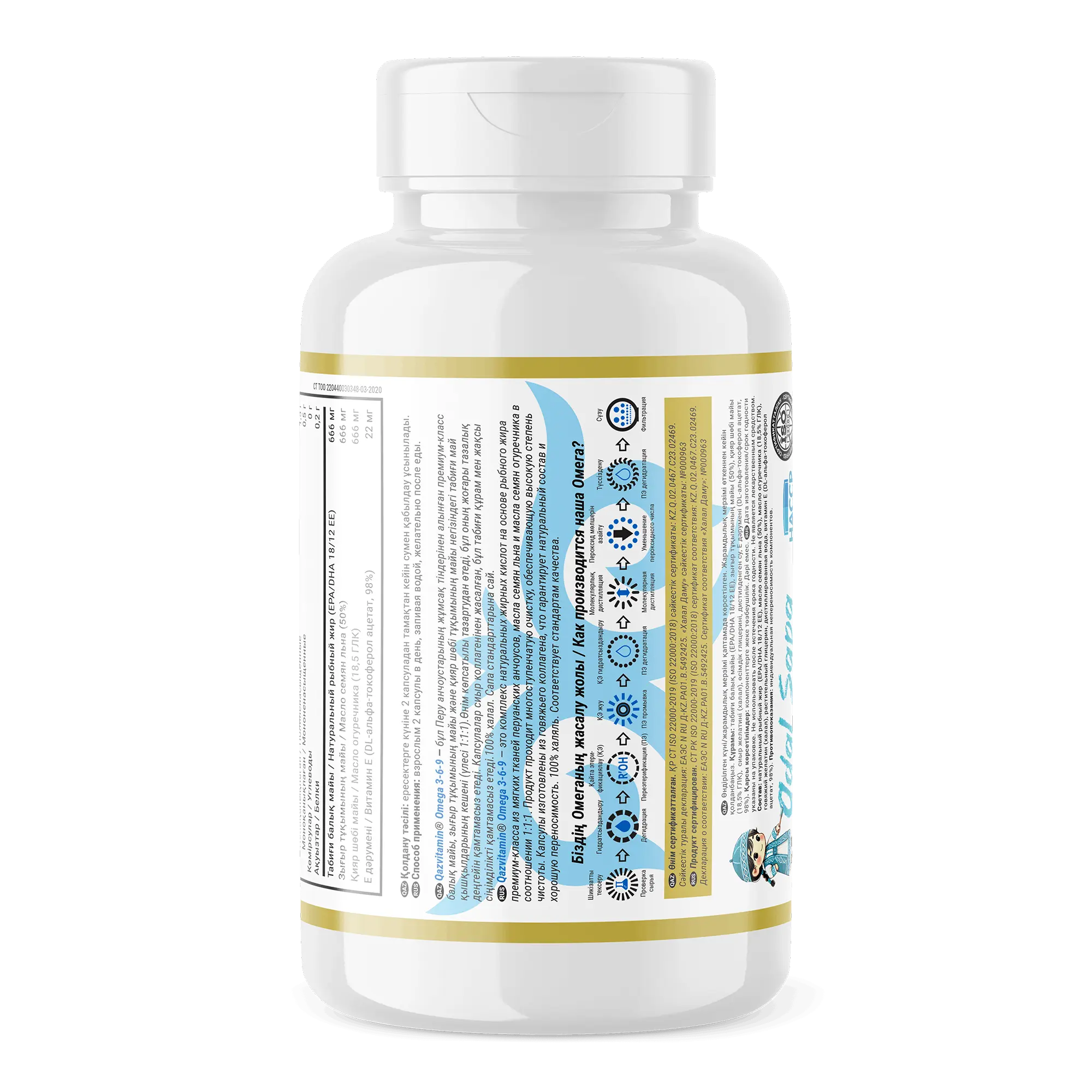 Qazvitamin Omega-3 - это натуральный рыбный жир премиум качества, выделяемый из мягких тканей перуанских анчоусов. Qazvitamin Omega-3 проходит 8 этапов очистки, гарантирующих полное отсутствие вредных веществ в готовом продукте. Капсулы изготовлены из рыбного коллагена, что обеспечивает натуральный состав и хорошую переносимость. Продукт соответствует стандартам качества и является 100% халяль.